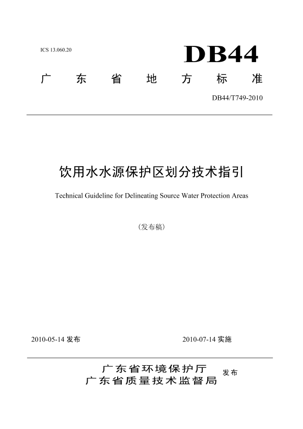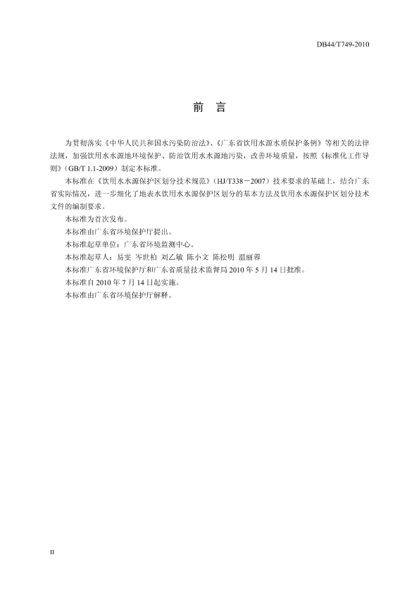为贯彻落实《中华人民共和国水污染防治法》、《广东省饮用水源水质保护条例》等相关的法律法规,加强饮用水水源地环境保护、防治饮用水水源地污染,改善环境质量,按照《标准化工作导则》(GB/T 1.1-2009)制定本标准。 本标准在《饮用水水源保护区划分技术规范》(HJ/T338-2007)技术要求的基础上,结合广东省实际情况,进一步细化了地表水饮用水水源保护区划分的基本方法及饮用水水源保护区划分技术文件的编制要求。 本标准为首次发布。 本标准由广东省环境保护厅提出。 本标准起草单位:广东省环境监测中心。 本标准起草人:易雯 岑世柏 刘乙敏 陈小文 陈松明 温丽蓉 本标准广东省环境保护厅和广东省质量技术监督局2010年5月14日批准。 本标准自2010年7月14日起实施。 本标准由广东省环境保护厅解释。