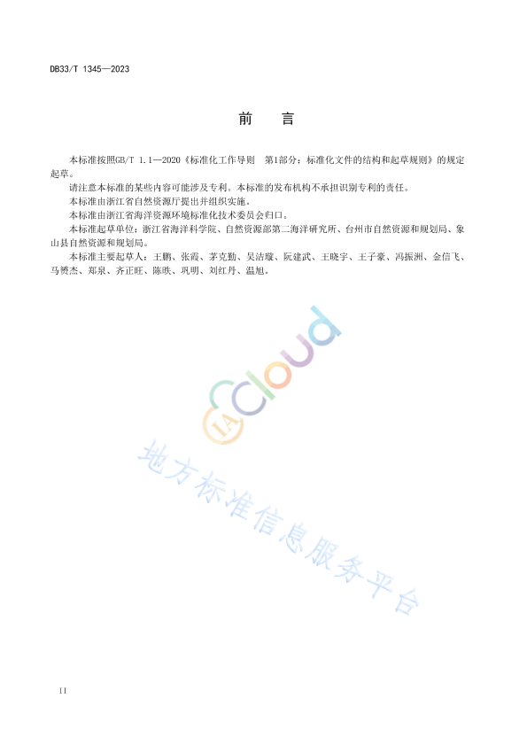 本标准按照GB/T1.1—2020《标准化工作导则第1部分:标准化文件的结构和起草规则》的规定起草。 请注意本标准的某些内容可能涉及专利。本标准的发布机构不承担识别专利的责任。 本标准由浙江省自然资源厅提出并组织实施。 本标准由浙江省海洋资源环境标准化技术委员会归口。 本标准起草单位:浙江省海洋科学院、自然资源部第二海洋研究所、台州市自然资源和规划局、象山县自然资源和规划局。 本标准主要起草人:王鹏、张霞、茅克勤、吴洁璇、阮建武、王晓宇、王子豪、冯振洲、金信飞、马赟杰、郑泉、齐正旺、陈昳、巩明、刘红丹、温旭。
