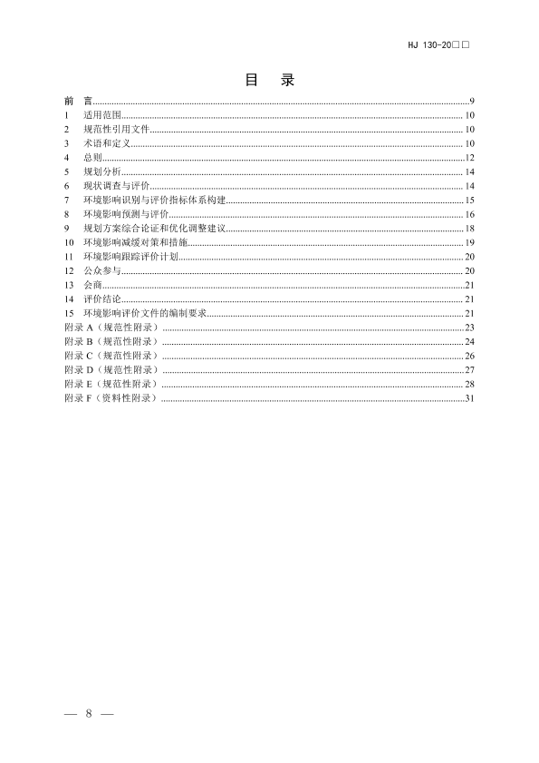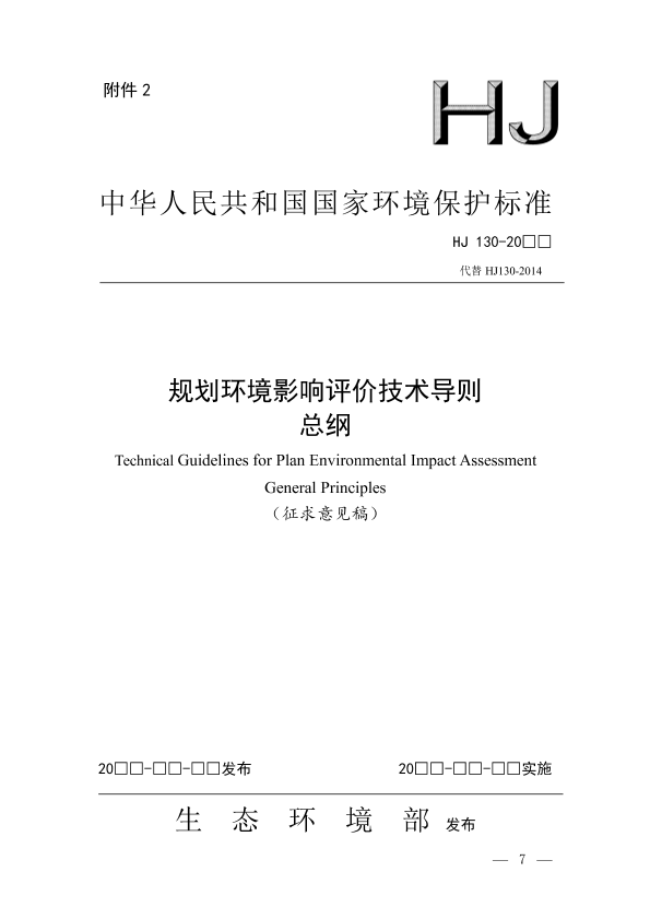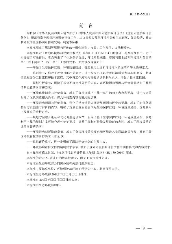 为贯彻《中华人民共和国环境保护法》《中华人民共和国环境影响评价法》《规划环境影响评价条例》,规范和指导规划环境影响评价工作,从决策源头预防环境污染和生态破坏,促进经济、社会和环境的全面协调可持续发展,制定本标准。 本标准规定了规划环境影响评价的一般性原则、内容、工作程序、方法和要求。 本标准是对《规划环境影响评价技术导则 总纲》(HJ 130-2014)的修订,与原标准相比,进一步提高了可操作性,重点突出了“生态保护红线、环境质量底线、资源利用上线和环境准入负面清单”(以下简称“三线一单”)工作的要求,主要修改内容如下: ——增加了生态保护红线、环境质量底线、资源利用上线和环境准入负面清单等术语和定义。 ——总则章节,修改了评价目的相关表述,进一步突出了以改善环境质量为核心的要求;将评价流程分为工作流程和技术流程,其中将工作流程内容要求调整到附录 A,增加了技术流程图。 ——规划分析章节,删除了规划不确定性分析的内容,在环境影响预测与评价章节增加了预测情景设置的内容和要求。 ——环境现状调查与评价章节,增加了分析区域“三线一单”的相关内容和要求,进一步完善明确了现状调查相关要求,将具体调查内容调整到附录 B。 ——环境影响预测与评价章节,强化了结合情景方案开展预测与评价的要求,增加了对优化调整后方案预测与评价的内容,明确了规划实施后能否满足生态保护红线、环境质量底线、资源利用上线要求的分析内容。 ——规划方案综合论证和优化调整建议章节,明确了基于生态保护红线、环境质量底线、资源利用上线的规划方案环境合理性论证要求;调整了规划可持续发展论证的表述,增加了环境效益论证的内容和要求。 ——环境影响减缓措施章节,增加了分区环境管控要求和环境准入负面清单等内容,补充了分区环境管控的内容要求(附录 D)。 ——跟踪评价章节,进一步明确了跟踪评价计划的主要内容。 ——环境影响评价文件的编制要求章节,增加了规划环境影响评价文件中图件格式和内容要求。 自本标准实施之日起,《规划环境影响评价技术导则 总纲》(HJ 130-2014)废止。 本标准的附录 A~附录 E 为规范性附录,附录 F 为资料性附录。 本标准由生态环境部会同国务院有关部门组织制定。 本标准主要起草单位:环境保护部环境工程评估中心、北京师范大学。 本标准生态环境部 201□年□□月□□日批准。 本标准自 201□年□□月□□日起实施。 本标准由生态环境部解释。