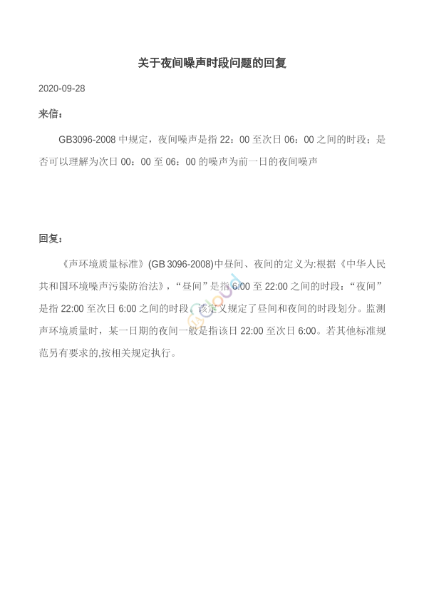 来信: GB3096-2008中规定,夜间噪声是指22:00至次日06:00之间的时段;是否可以理解为次日00:00至06:00的噪声为前一日的夜间噪声