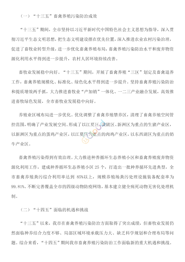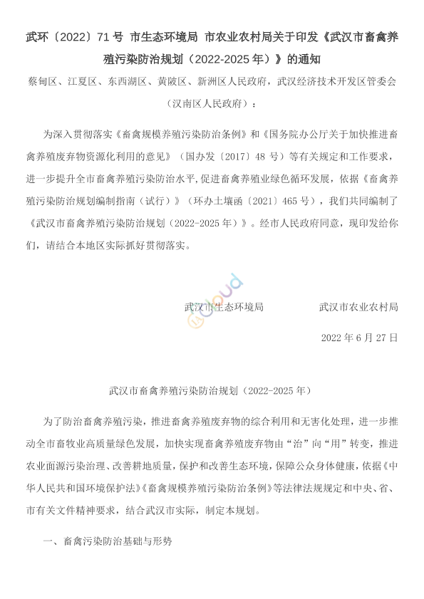 蔡甸区、江夏区、东西湖区、黄陂区、新洲区人民政府,武汉经济技术开发区管委会(汉南区人民政府): 为深入贯彻落实《畜禽规模养殖污染防治条例》和《国务院办公厅关于加快推进畜禽养殖废弃物资源化利用的意见》(国办发〔2017〕48号)等有关规定和工作要求,进一步提升全市畜禽养殖污染防治水平,促进畜禽养殖业绿色循环发展,依据《畜禽养殖污染防治规划编制指南(试行)》(环办土壤函〔2021〕465号),我们共同编制了《武汉市畜禽养殖污染防治规划(2022-2025年)》。经市人民政府同意,现印发给你们,请结合本地区实际抓好贯彻落实。 武汉市生态环境局 武汉市农业农村局 2022年6月27日