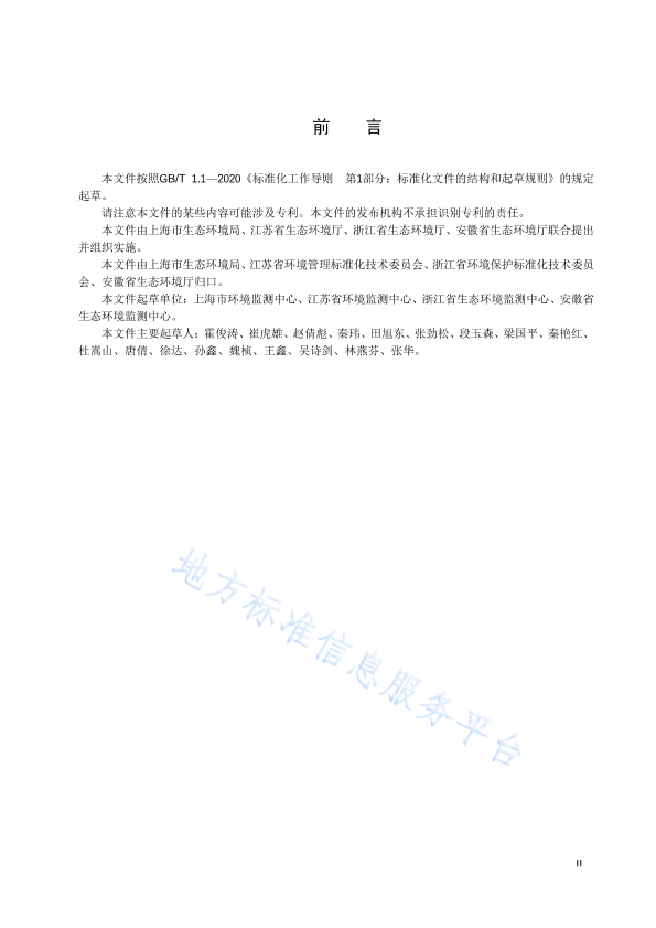 本文件按照GB/T 1.1- -2020 《标准化工作导则第1部分: 标准化文件的结构和起草规则》的规定起草。 请注意本文件的某些内容可能涉及专利。本文件的发布机构不承担识别专利的责任。 本文件由上海市生态环境局、江苏省生态环境厅、浙江省生态环境厅、安徽省生态环境厅联合提出并组织实施。 本文件由上海市生态环境局、江苏省环境管理标准化技术委员会、浙江省环境保护标准化技术委员会、安徽省生态环境厅归口。 本文件起草单位:上海市环境监测中心、江苏省环境监测中心、浙江省生态环境监测中心、安徽省生态环境监测中心。 本文件主要起草人:霍俊涛、崔虎雄、赵倩彪、秦玮、田旭东、张劲松、段玉森、梁国平、秦艳红、杜嵩山、唐倩、徐达、孙鑫、魏桢、王鑫、吴诗剑、林燕芬、张华。
