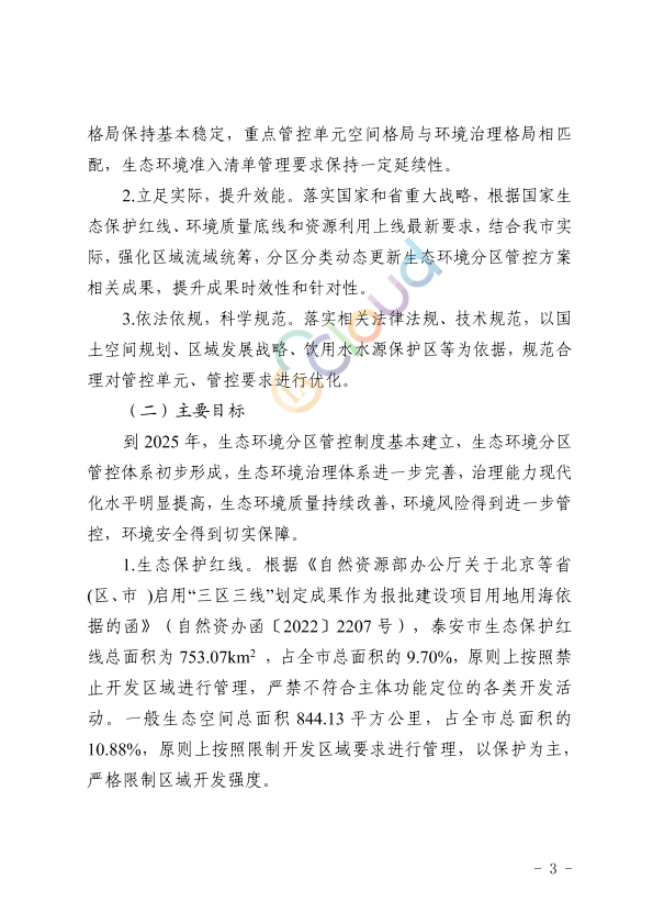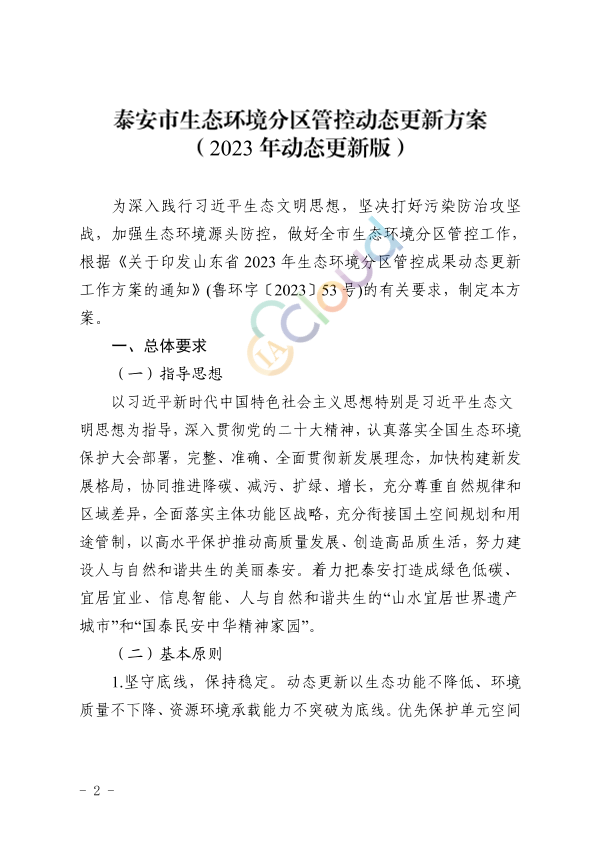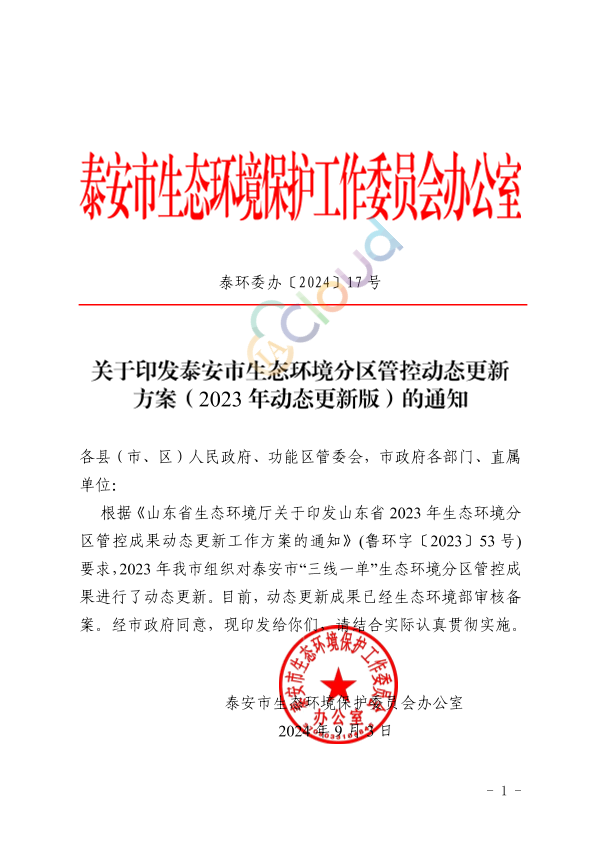 各县(市、区)人民政府、功能区管委会,市政府各部门、直属单位: 根据《山东省生态环境厅关于印发山东省 2023 年生态环境分区管控成果动态更新工作方案的通知》(鲁环字〔2023〕53 号)要求,2023 年我市组织对泰安市“三线一单”生态环境分区管控成果进行了动态更新。目前,动态更新成果已经生态环境部审核备案。经市政府同意,现印发给你们,请结合实际认真贯彻实施。 泰安市生态环境保护委员会办公室 2024 年 9 月 3 日