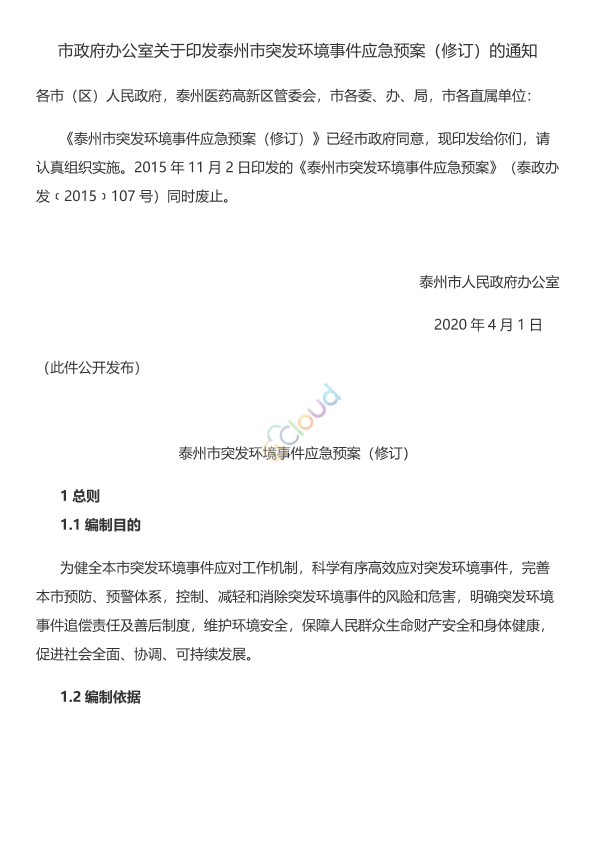 各市(区)人民政府,泰州医药高新区管委会,市各委、办、局,市各直属单位: 《泰州市突发环境事件应急预案(修订)》已经市政府同意,现印发给你们,请认真组织实施。2015年11月2日印发的《泰州市突发环境事件应急预案》(泰政办发﹝2015﹞107号)同时废止。 泰州市人民政府办公室 2020年4月1日