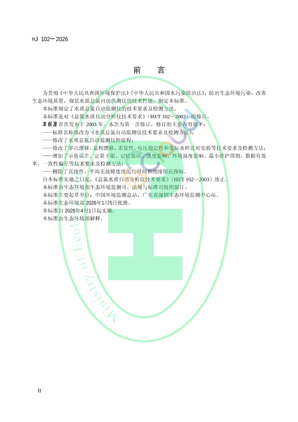 为贯彻《中华人民共和国环境保护法》《中华人民共和国水污染防治法》,防治生态环境污染,改善生态环境质量,规范水质总氮自动监测仪的技术性能,制定本标准。 本标准规定了水质总氮自动监测仪的技术要求及检测方法。 本标准是对《总氮水质自动分析仪技术要求》(HJ/T 102—2003)的修订。