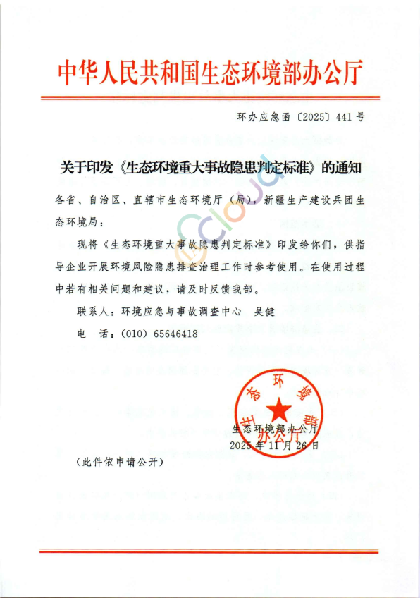 各省、自治区、直辖市生态环境厅(局),新疆生产建设兵团生态环境局: 现将《生态环境重大事故隐患判定标准》印发给你们,供指导企业开展环境风险隐患排查治理工作时参考使用。在使用过程中若有相关问题和建议,请及时反馈我部。 联系人:环境应急与事故调查中心吴健 电 话:(010)65646418 生态环境部办公厅 2025年11月26日