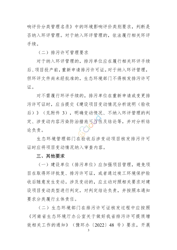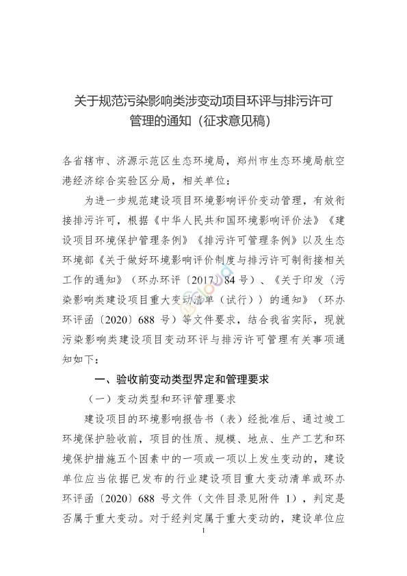 为进一步规范建设项目环境影响评价变动管理,有效衔接排污许可,我厅起草了《关于规范污染影响类涉变动项目环评与排污许可管理的通知》(见附件)。现公开征求意见,相关单位可在2023年1月10日前以书面邮寄、传真或电子邮箱方式反馈意见。 联系人:鲁雪燕 联系电话:0371-66309113 电子邮箱:shenghuanpingchu@126.com 附件:关于规范污染影响类涉变动项目环评与排污许可管理的通知(征求意见稿).pdf 2023年1月3日