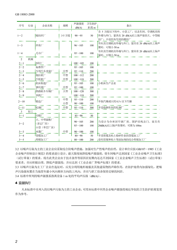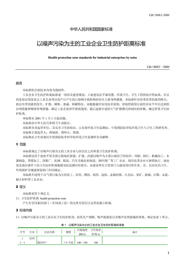 本标准规定了以噪声污染为主的工业企业与居住区之间所需卫生防护距离。 本标准适用于地处平原及微丘陵地区新建、扩建、改建以噪声为主要污染因子的纺织、印刷、制钉、机械加工、木器制造、型煤加工、面粉厂、轧钢、锻造、汽车及拖拉机制造、钢丝绳厂等工厂企业。现有此类企业可参照执行。地处复杂地形条件下的卫生防护距离根据实际监测评价报告,由建设单位主管部门与建设项目所在省、市、自治区的卫生、环境保护及城建规划部门共同确定。 本标准不适用于以气型污染为主的化工、农药、橡胶、制药、造纸、金属冶炼、火电站、采矿、玻璃、石棉、水泥、耐火材料等工业企业。