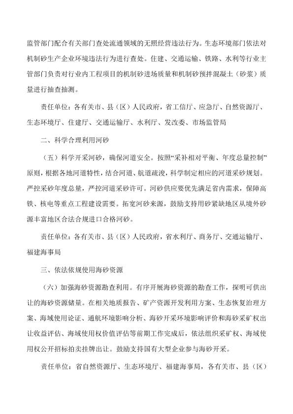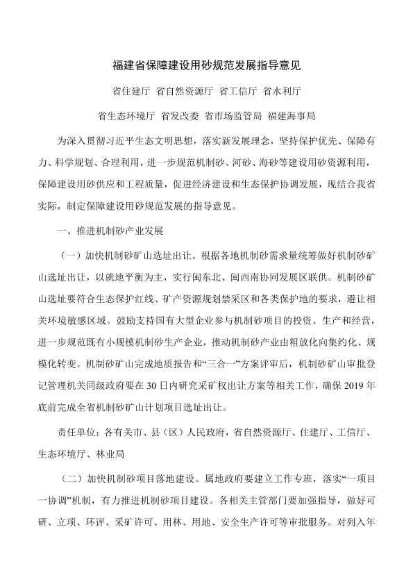 各市、县(区)人民政府,平潭综合实验区管委会,省人民政府各部门、各直属机构,各大企业,各高等院校: 省住建厅、自然资源厅、工信厅、水利厅、生态环境厅、发改委、市场监管局、福建海事局制定的《福建省保障建设用砂规范发展指导意见》已经省政府研究同意,现转发给你们,请认真组织实施。 福建省人民政府办公厅 2019年8月16日