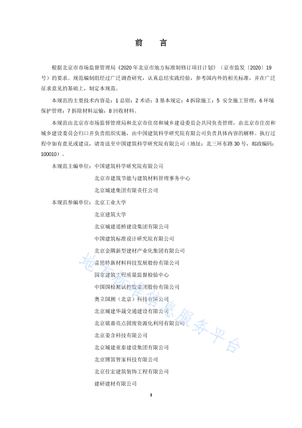 根据北京市市场监督管理局(2020 年北京市地方标准制修订项目计划》(京市监发 (2020) 19号)的要求。规范编制组经过广泛调查研究,认真总结实践经验,参考国内外的相关标准,并在广泛征求意见的基础上,制定本规范。 本规范的主要技术内容是: 1总则: 2术语: 3基本规定: 4拆除施工: 5安全施工管理: 6环境保护管理: 7拆除材料运输: 8 回收材料。. 本规范由北京市市场监督管理局和北京市住房和城乡建设委员会共同负责管理,由北京市住房和城乡建设委员会归口并负责组织实施,由中国建筑科学研究院有限公司负责具体内容的解释。执行过程中如有意见或建议,请寄送至中国建筑科学研究院有限公司(地址:北三环东路30号,邮政编码:100010)。 本规范主编单位:中国建筑科学研究院有限公司 北京市建筑节能与建筑材料管理事务中心 北京城建集团有限责任公司. 本规范参编单位:北京工业大学 北京建筑大学 北京城建道桥建设集团有限公司 中国建筑标准设计研究院有限公司 北京金隅新型建材产业化集团有限公司 畜思特新材料科技发展股份有限公司 国家建筑工程质量监督检验中心 中国国检测试控股集团股份有限公司 奥立国测(北京)科技有限公司 北京城建华晟交通建设有限公司 北京铭嘉亮点固废资源化利用有限公司 北京姜含科技有限公司. 北京城建亚泰建设集团有限公司 本规范主要起草人员:黄靖 邢晶明 韦寒波 曹力强 徐静 张鹏常 金波 申和庆 孙诗兵 张勇 周文娟 陈超 张雅芬 魏素巍 周建 叶武平 张湛 刘东华 李鹏伟 陈慧娜 孙博 谢瑜昱 吴斌 高海辰 刘亚运 刘俊祥 王忠民 田振广 王欣 郭承博 王小燕 梁瑞华 本规范主要审查人员:石云兴 路国忠 檀春丽 李烁 李清海 许锦峰 赵长军