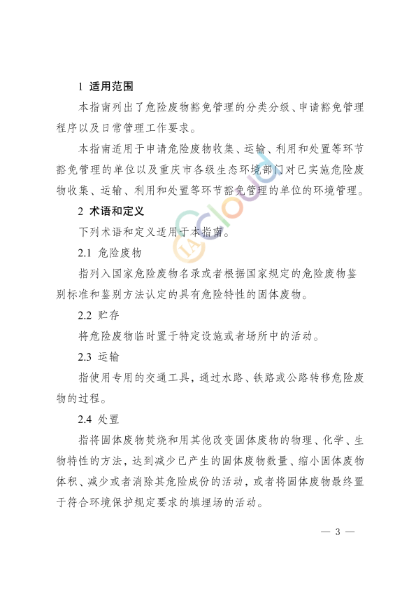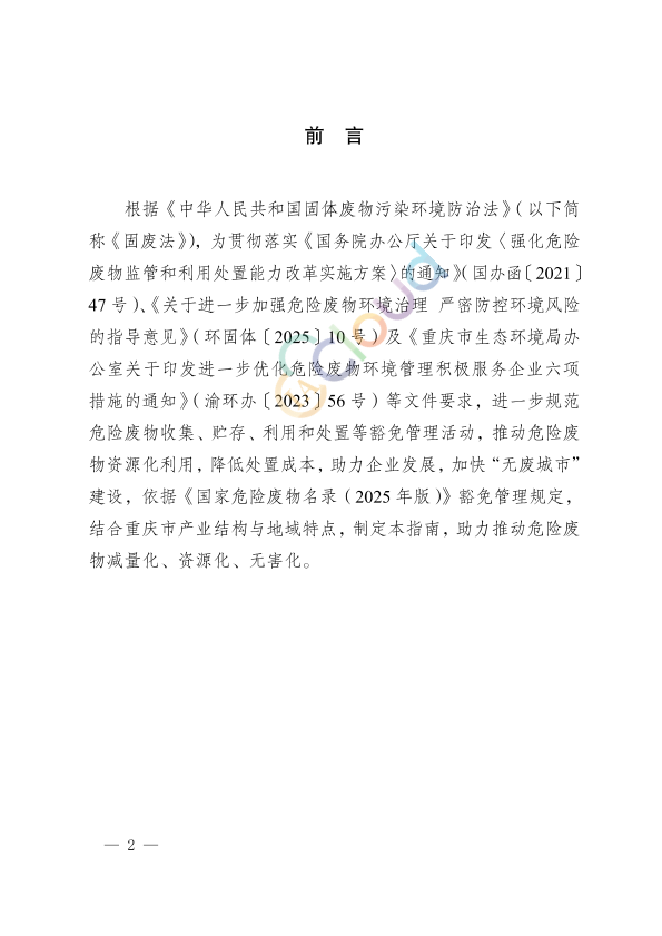 各区县(自治县)生态环境局,西部科学城重庆高新区、万盛经开区生态环境局: 为贯彻落实《关于进一步加强危险废物环境治理严密防控环境风险的指导意见》(环固体〔2025〕10号)和《关于印发重庆市强化危险废物监管和利用处置能力改革工作方案的通知》(渝府办发〔2022〕17号)等要求,不断提升危险废物规范化管理水平。现将《重庆市危险废物豁免管理指南》印发给你们,请结合实际,做好指导服务工作。 重庆市生态环境局 2025年12月10日
