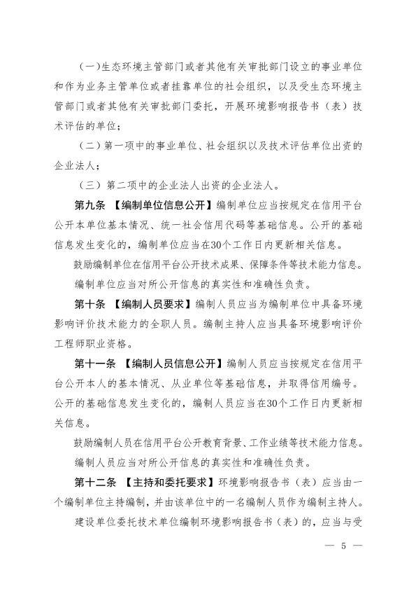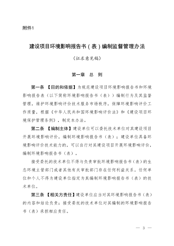 关于公开征求《建设项目环境影响报告书(表)编制监督管理办法(征求意见稿)》及其配套文件意见的通知 为规范建设项目环境影响报告书(表)编制行为,加强建设项目环境影响评价事中事后监管,维护环境影响评价技术服务市场秩序,保障环境影响评价工作质量,根据《中华人民共和国环境影响评价法》和有关法律法规要求,我部组织起草了《建设项目环境影响报告书(表)编制监督管理办法(征求意见稿)》,拟以部门规章形式发布。 现将该办法征求意见稿以及《建设项目环境影响报告书(表)编制能力建设指南(征求意见稿)》《建设项目环境影响报告书(表)编制失信行为记分办法(征求意见稿)》和《建设项目环境影响报告书(表)编制单位和编制人员信息公开管理规定(征求意见稿)》等3项配套文件一并向社会公开征求意见。 各有关单位和个人均可于2019年4月3日前将书面意见和建议反馈我部。 联系人:环境影响评价与排放管理司马园园、应利 电话:(010)66556428、66556408 传真:(010)66556428 邮箱:huanpingsizonghechu@mee.gov.cn 通讯地址:北京市西城区西直门南小街115号 邮政编码:100035 附件:1.建设项目环境影响报告书(表)编制监督管理办法(征求意见稿) 2.建设项目环境影响报告书(表)编制能力建设指南(征求意见稿) 3.建设项目环境影响报告书(表)编制失信行为记分办法(征求意见稿) 4.建设项目环境影响报告书(表)编制单位和编制人员信息公开管理规定(征求意见稿) 5.《建设项目环境影响报告书(表)编制监督管理办法(征求意见稿)》及其配套文件编制说明 生态环境部办公厅 2019年2月28日 抄送:各省、自治区、直辖市生态环境厅(局),新疆生产建设兵团环境保护局。