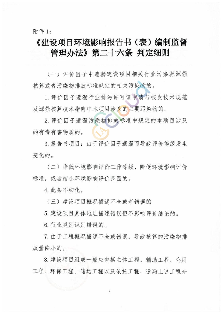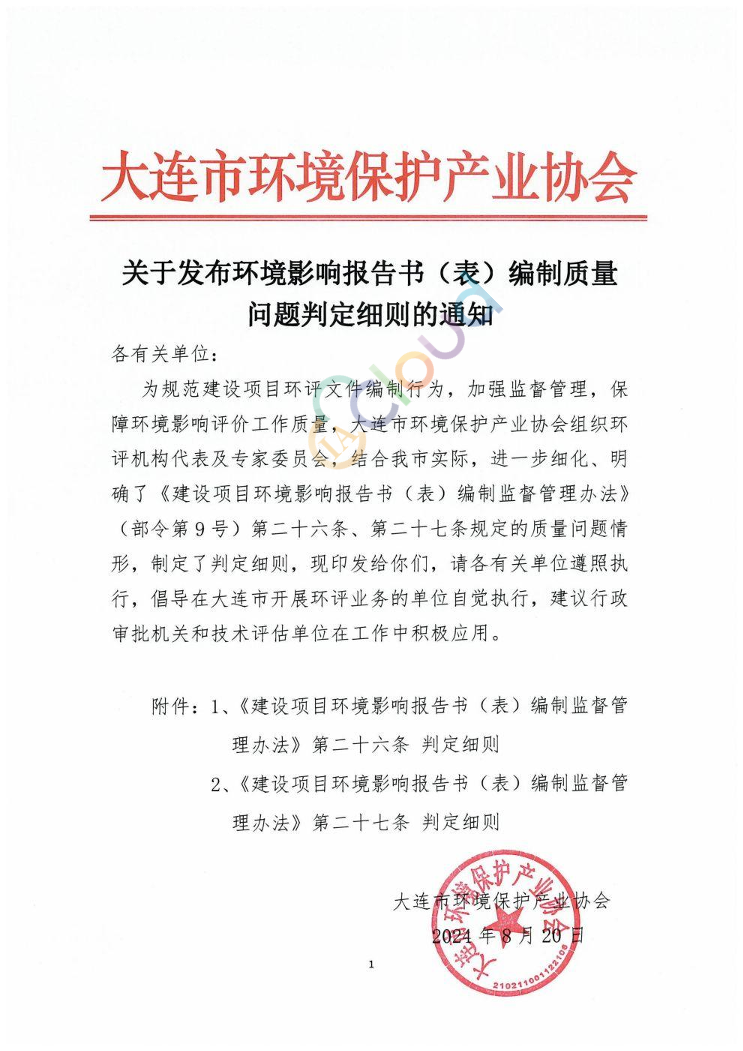 各有关单位: 为规范建设项目环评文件编制行为,加强监督管理,保障环境影响评价工作质量,大连市环境保护产业协会组织环评机构代表及专家委员会,结合我市实际,进一步细化、明确了《建设项目环境影响报告书(表)编制监督管理办法》(部令第9号)第二十六条、第二十七条规定的质量问题情形,制定了判定细则,现印发给你们,请各有关单位遵照执行,倡导在大连市开展环评业务的单位自觉执行,建议行政审批机关和技术评估单位在工作中积极应用。 附件:1、《建设项目环境影响报告书(表)编制监督管理办法》第二十六条判定细则 2、《建设项目环境影响报告书(表)编制监督管理办法》第二十七条判定细则 大连市环境保护产业协会 2024年8月20日