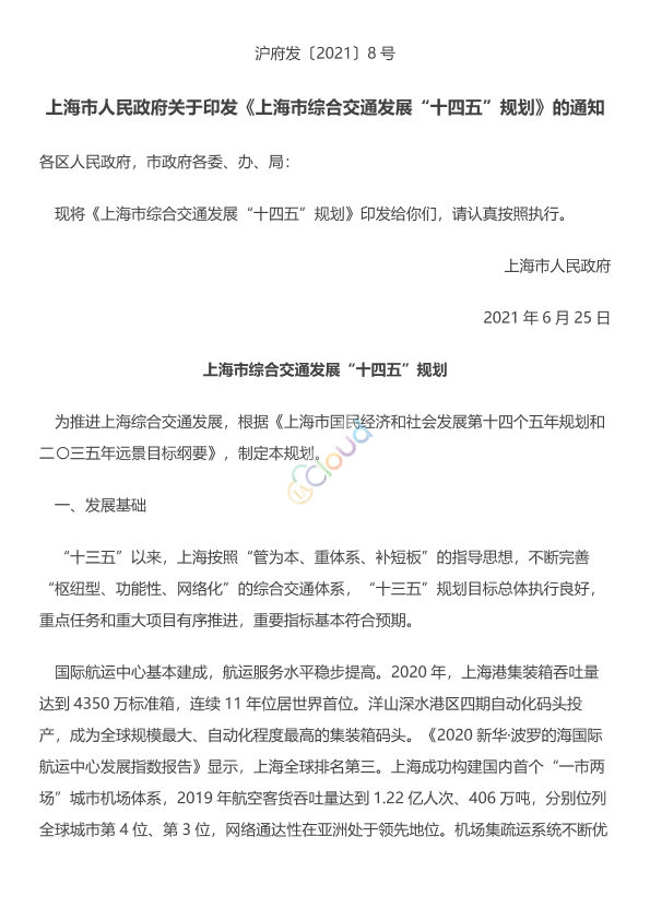 各区人民政府,市政府各委、办、局: 现将《上海市综合交通发展“十四五”规划》印发给你们,请认真按照执行。 上海市人民政府 2021年6月25日