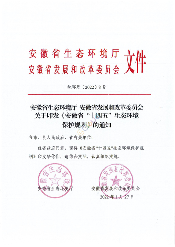 各市、县人民政府,省有关单位: 经省政府同意,现将《安徽省“十四五”生态环境保护规划》印发给你们,请结合实际,认真组织实施。