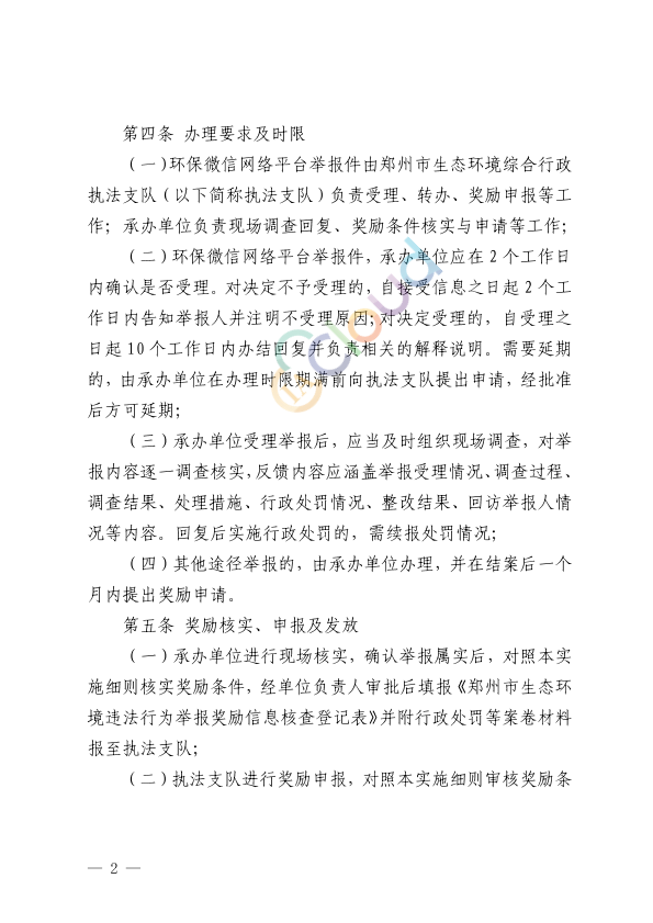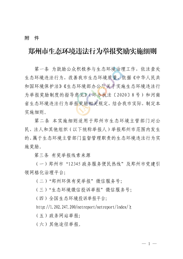 各开发区、区县(市)分局,各有关单位: 为鼓励公众积极参与生态环境治理工作,依法查处生态环境违法行为,改善我市生态环境质量,依据《中华人民共和国环境保护法》《生态环境部办公厅关于实施生态环境违法行为举报奖励制度的指导意见》(环办执法〔2020〕8号)和河南省生态环境违法行为举报奖励相关规定,结合我市实际,我局组织制订了《郑州市生态环境违法行为举报奖励实施细则》,现印发给你们,请认真贯彻落实。 附件:《郑州市生态环境违法行为举报奖励实施细则》 2025年8月11日