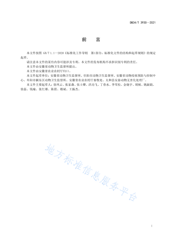 本文件按照GB/T1.1- 2020 《标准化工作导则第1部分: 标准化文件的结构和起草规则》的规定起草。 请注意本文件的某些内容可能涉及专利。本文件的发布机构不承担识别专利的责任。 本文件由安徽省动物卫生监督所提出。 本文件由安徽省农业农村厅归口。 本文件起草单位:安徽省动物卫生监督所、阜阳市动物卫生监督所、安徽省动物疫病预防与控制中心、阜阳市颍东区动物卫生监督所、安徽省农业农村厅畜牧处、太和县安泰动物无害化处理厂。 本文件主要起草人:徐凤云、张家森、张士卿、洪功飞、丁春水、李雪松、金晓宇、胡桢、姚淑娟、徐磊、钱瑜、张红璠、陈晨、嵇斌、王振杰。