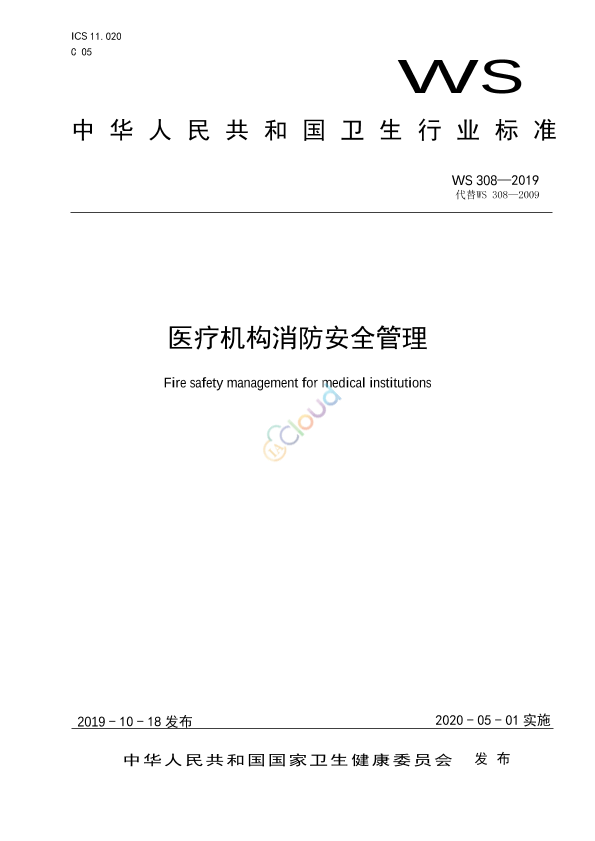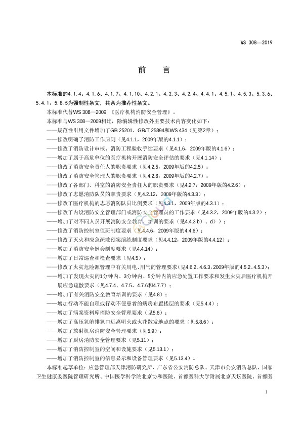 本标准的4.1.4、4.1.6、4.1.7、4.1.10、4.2.1、4.2.3、4.2.4、4.4.1、4.5.1、4.5.3、5.3.6、5.4.1、5.8.5为强制性条文,其余为推荐性条文。 本标准代替WS 308—2009 《医疗机构消防安全管理》。 本标准与WS 308—2009相比,除编辑性修改外主要技术内容变化如下: ——规范性引用文件增加了GB 25201、GB/T 25894和WS 434(见第2章); ——修改明确了消防工作原则(见4.1.1,2009年版的4.1.1); ——修改了消防设计审核、消防工程验收手续要求(见4.1.6,2009年版的4.1.6); ——增加了属于高危单位的医疗机构开展消防安全评估的要求(见4.1.14); ——修改了消防安全责任人的职责要求(见4.2.5,2009年版的4.2.5); ——修改了消防安全管理人的职责要求(见4.2.6,2009年版的4.2.7); ——修改了各部门、科室的消防安全责任人的职责要求(见4.2.7,2009年版的4.2.6); ——修改了志愿消防队员的职责要求(见4.2.12,2009年版的4.3.3); ——修改了医疗机构的志愿消防队员比例要求(见4.3.1,2009年版的4.3.1); ——修改了内设消防安全管理部门或消防安全管理员的工作要求(见4.3.2,2009年版的4.3.2); ——增加了对不同人员开展消防安全教育、培训的要求(见4.4.3 b)、d)); ——修改了消防控制室值班制度要求(见4.4.6,2009年版的4.4.6); ——修改了灭火和应急疏散预案演练制度要求(见4.4.12,2009年版的4.4.12); ——增加了消防安全例会制度要求(见4.4.14); ——增加了日常巡查和检查要求(见4.5); ——修改了火灾危险源管理中有关用电、用气的管理要求(见4.6.2、4.6.3,2009年版的4.5.2、4.5.3); ——增加了发现火灾的1分钟内、3分钟内、5分钟内的应急处置工作要求和发生火灾后医疗机构开展应急疏散要求(见4.7.4、4.7.5、4.7.6和4.7.7); ——增加了有关消防安全教育培训的要求(见4.8); ——增加行动不能自理或行动不便患者的病房布置楼层的要求(见5.4.4); ——增加了病案资料库消防安全管理要求(见5.6); ——增加了高压氧舱排氧口远离明火或火花散发地点的要求(见5.8.6); ——增加了放射机房消防安全管理要求(见5.9); ——增加了厨房消防安全管理要求(见5.11); ——增加了消防控制室的空间和设施要求(见5.13.1); ——增加了消防控制室的信息显示和设备管理要求(见5.13.4)。 本标准起草单位:应急管理部天津消防研究所、广东省公安消防总队、天津市公安消防总队、国家卫生健康委医院管理研究所、中国医学科学院北京协和医院、首都医科大学附属北京天坛医院、首都医科大学附属北京同仁医院、北京大学人民医院、北京医院、中国医学科学院阜外医院、北京回龙观医院、中国医学科学院整形外科医院、天津市第一中心医院 本标准主要起草人:倪照鹏、阚强、韩伟平、罗云庆、鲁云龙、闫家伟、郭宇、柴建军、解予谦、马洁、杨京山、郑毅身、潘延池、唐命、赵唯萍、胡扬波 本标准代替标准的历次版本发布情况为: ——WS 308—2009。
