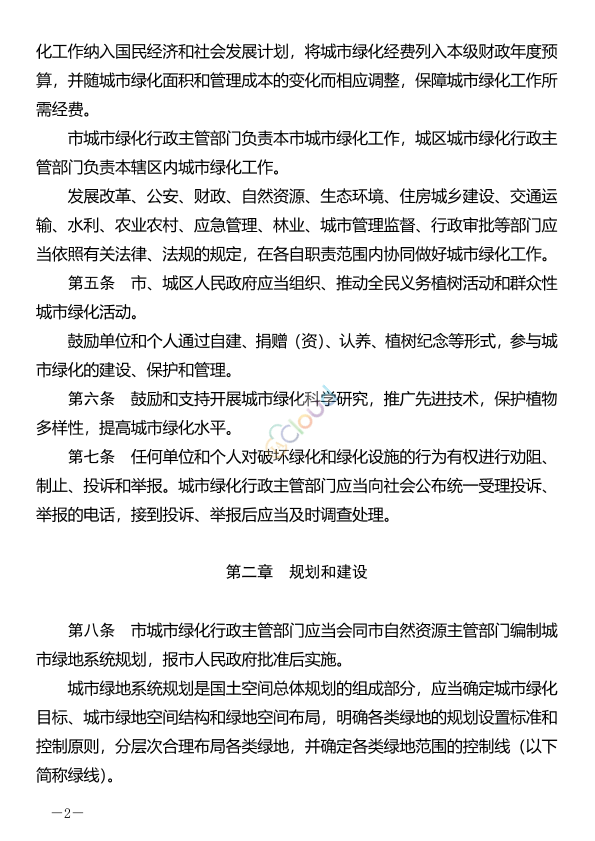 2. 规划和建设:规定了城市绿地系统规划的编制、绿地率标准、绿线的划定和调整、绿化植物的选
