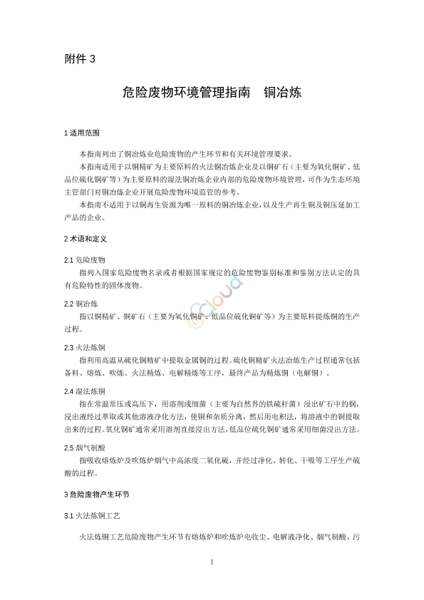 本指南列出了铜冶炼业危险废物的产生环节和有关环境管理要求。 本指南适用于以铜精矿为主要原料的火法铜冶炼企业及以铜矿石(主要为氧化铜矿、低品位硫化铜矿等)为主要原料的湿法铜冶炼企业内部的危险废物环境管理,可作为生态环境主管部门对铜冶炼企业开展危险废物环境监管的参考。 本指南不适用于以铜再生资源为唯一原料的铜冶炼企业,以及生产再生铜及铜压延加工产品的企业。