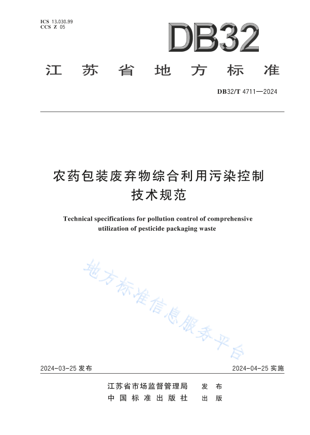 本文件规定了农药包装废弃物的收集、贮存和运输要求,以及塑料类农药包装废弃物综合利用工艺过程、环境保护、综合利用产物控制的技术要求以及运行管理要求。 本文件适用于农药包装废弃物的收集、贮存、运输和综合利用污染控制全过程管理,以及与农药包装废弃物综合利用有关的建设项目环境影响评价、环境保护设施设计、竣工环境保护验收、排污许可管理、清洁生产审核等。