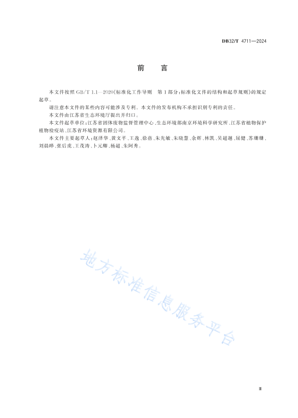 本文件按照 GB/T 1.1—2020《标准化工作导则ꢀ第 1 部分:标准化文件的结构和起草规则》的规定起草。 请注意本文件的某些内容可能涉及专利。本文件的发布机构不承担识别专利的责任。 本文件由江苏省生态环境厅提出并归口。 本文件起草单位:江苏省固体废物监督管理中心、生态环境部南京环境科学研究所、江苏省植物保护植物检疫站、江苏省环境资源有限公司。