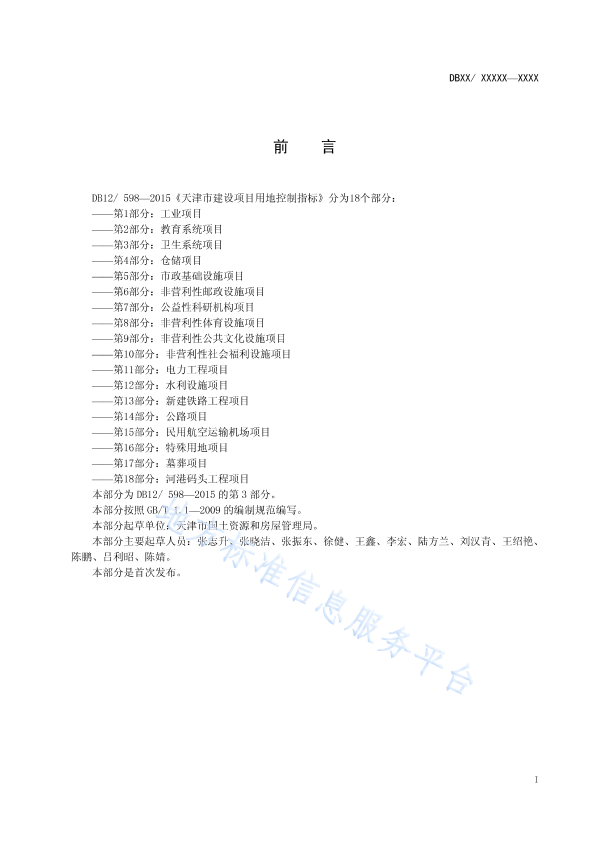 DB12/T 598- -2015 《天津市建设项目用地控制指标》分为18个部分: