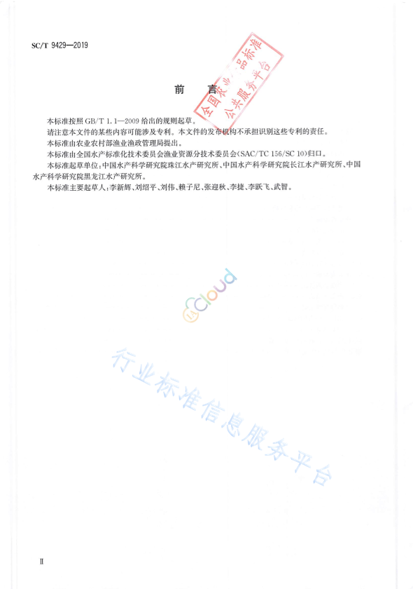 本标准按照GB/T 1. 1- -2009给出的规则起草。 请注意本文件的某些内容可能涉及专利。本文件的发布机构不承担识别这些专利的责任。 本标准由农业农村部渔业渔政管理局提出。 本标准由全国水产标准化技术委员会渔业资源分技术委员会(SAC/TC156/SC10归口。 本标准起草单位:中国水产科学研究院珠江水产研究所、中国水产科学研究院长江水产研究所、中国水产科学研究院黑龙江水产研究所。 本标准主要起草人:李新辉、刘绍平、刘伟、赖子尼、张迎秋、李捷、李跃飞、武智。