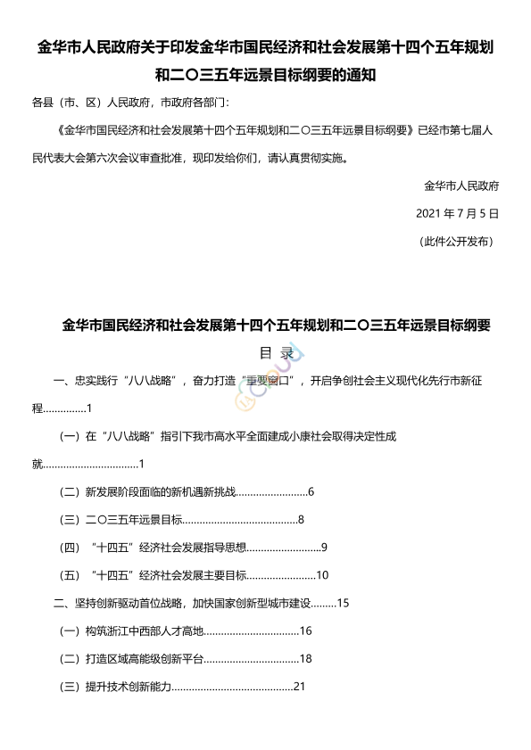 金华市人民政府关于印发金华市国民经济和社会发展第十四个五年规划和二〇三五年远景目标纲要的通知.pdf