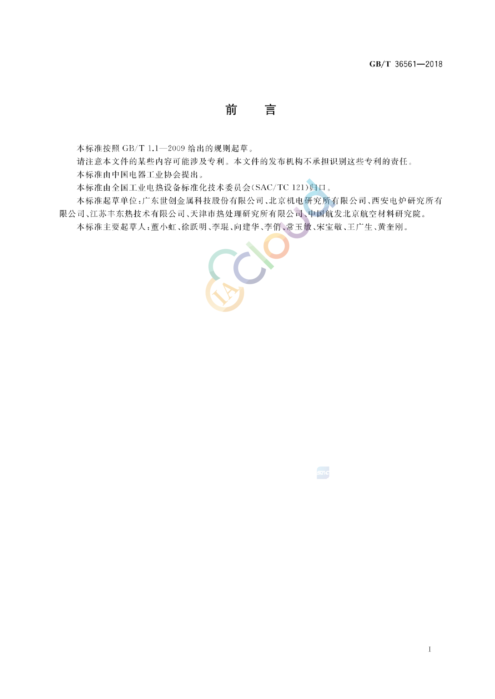 本标准按照GB/T1.1—2009给出的规则起草。 请注意本文件的某些内容可能涉及专利。本文件的发布机构不承担识别这些专利的责任。本标准由中国电器工业协会提出。 本标准由全国工业电热设备标准化技术委员会(SAC/TC 121)归口。 主要起草单位 广东世创金属科技股份有限公司 、北京机电研究所有限公司 、西安电炉研究所有限公司 、江苏丰东热技术有限公司 、天津市热处理研究所有限公司 、中国航发北京航空材料研究院 。 主要起草人 董小虹 、徐跃明 、李琨 、向建华 、李俏 、常玉敏 、宋宝敬 、王广生 、黄奎刚 。