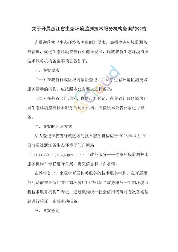 为贯彻落实《生态环境监测条例》要求,加强生态环境监测监督管理,促进生态环境监测行业健康发展,现就我省生态环境监测技术服务机构备案事项公告如下 浙江省生态环境厅 2026年1月13日