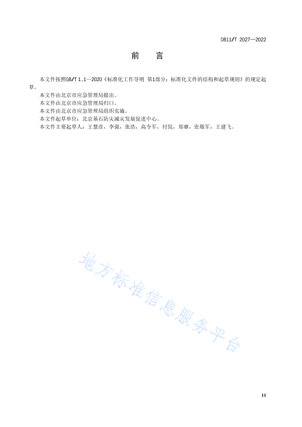 本文件按照GB/T 1.1- 2020 《标准化工作导则第1部分:标准化文件的结构和起草规则》的规定起草。 本文件由北京市应急管理局提出。 本文件由北京市应急管理局归口。 本文件由北京市应急管理局组织实施。 本文件起草单位:北京基石防灾减灾发展促进中心。 本文件主要起草人:王慧彦,李强,张浩,高令军,付侃,郑睿,张敬军,王建飞。