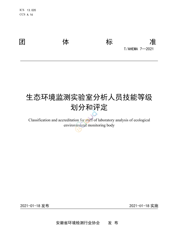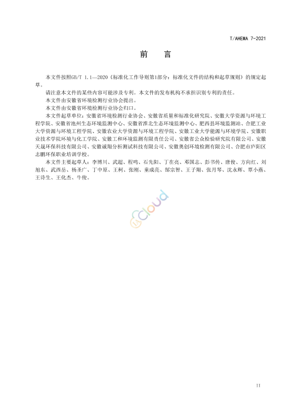 本文件按照GB/T 1.1—2020《标准化工作导则第1部分:标准化文件的结构和起草规则》的规定起草。请注意本文件的某些内容可能涉及专利。本文件的发布机构不承担识别专利的责任。 本文件由安徽省环境检测行业协会提出。 本文件由安徽省环境检测行业协会归口。 本文件起草单位:安徽省环境检测行业协会、安徽省质量和标准化研究院、安徽大学资源与环境工程学院、安徽省池州生态环境监测中心、安徽省淮北生态环境监测中心、肥西县环境监测站、合肥工业 大学资源与环境工程学院、安徽农业大学资源与环境工程学院、安徽工业大学能源与环境学院、安徽职业技术学院环境与化工学院、安徽工和环境监测有限责任公司、安徽省公众检验研究院有限公司、安徽天晟环保科技有限公司、安徽诚翔分析测试科技有限公司、安徽奥创环境检测有限公司、合肥市庐阳区志鹏环保职业培训学校。 本文件主要起草人:李博川、武超、程鸣、石先阳、丁在亮、邓国志、彭书传、唐俊、方向红、刘旭东、武西岳、杨圣广、丁中原、王柯、张刚、童成亮、郜宗智、王子翔、张月琴、沈永辉、覃小燕、 王诗生、王化杰、牛俊。