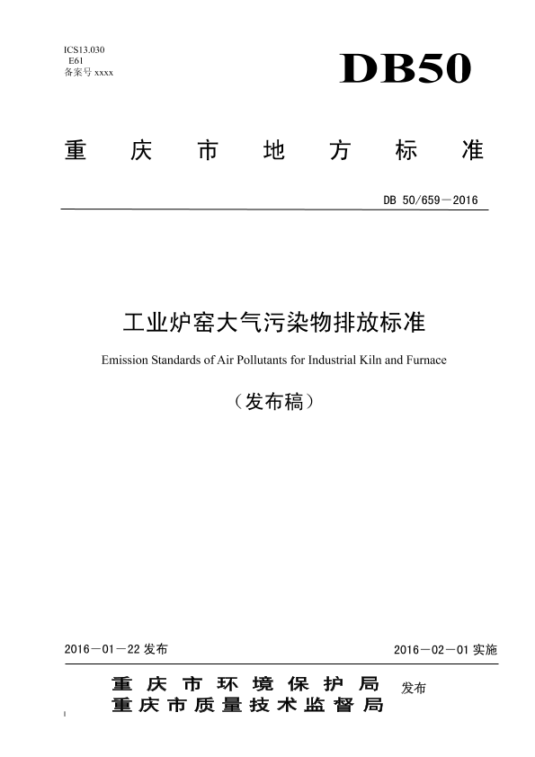 为贯彻《中华人民共和国环境保护法》、《中华人民共和国大气污染防治法》等法律、法规,保护环 境,防治污染,促进我市工业炉窑生产、运行和污染治理技术的进步,制定本标准。 本标准规定了我市工业炉窑大气污染物浓度排放限值、监测和监控要求。工业炉窑排放的水污染物、环境噪声适用相应的国家污染物排放标准,产生固体废物的鉴别、处理和处置适用国家固体废物污染控 制标准。 本标准依据GB/T1.1-2009规则编制。 本标准在本次修订的主要内容有: --调整标准执行的区域划分; --调整现有企业、新建企业部分大气污染物排放限值; --调整部分炉窑的过剩空气系数设置; --设定推荐性限值。 自本标准实施后,重庆市工业炉窑大气污染物排放控制按本标准的规定执行,不再执行《重庆市大气污染物综合排放标准》 (DB 50/86-2012)工业炉窑部分相关要求。 本标准是重庆市工业炉窑大气污染物排放控制的基本要求。环境影响评价文件或排污许可证要求严 于本标准时,按照批复的环境影响评价文件或排污许可证执行。 本标准由重庆市环境保护局提出并归口。 本标准起草单位:重庆市环境科学研究院。 本标准主要起草人:吴莉萍,周志恩,陈刚才,张丹,陈敏,罗倩,余海。 本标准由重庆市人民政府于2016年1月22日批准。 本标准自2016年2月1日实施。