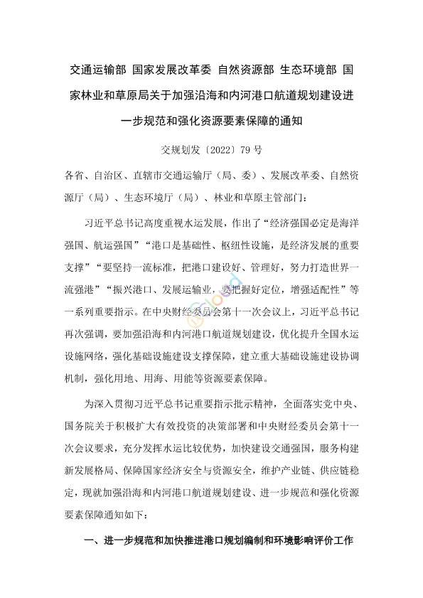 各省、自治区、直辖市交通运输厅(局、委)、发展改革委、自然资源厅(局)、生态环境厅(局)、林业和草原主管部门: 习近平总书记高度重视水运发展,作出了“经济强国必定是海洋强国、航运强国”“港口是基础性、枢纽性设施,是经济发展的重要支撑”“要坚持一流标准,把港口建设好、管理好,努力打造世界一流强港”“振兴港口、发展运输业,要把握好定位,增强适配性”等一系列重要指示。在中央财经委员会第十一次会议上,习近平总书记再次强调,要加强沿海和内河港口航道规划建设,优化提升全国水运设施网络,强化基础设施建设支撑保障,建立重大基础设施建设协调机制,强化用地、用海、用能等资源要素保障。 为深入贯彻习近平总书记重要指示批示精神,全面落实党中央、国务院关于积极扩大有效投资的决策部署和中央财经委员会第十一次会议要求,充分发挥水运比较优势,加快建设交通强国,服务构建新发展格局、保障国家经济安全与资源安全,维护产业链、供应链稳定,现就加强沿海和内河港口航道规划建设、进一步规范和强化资源要素保障通知如下: