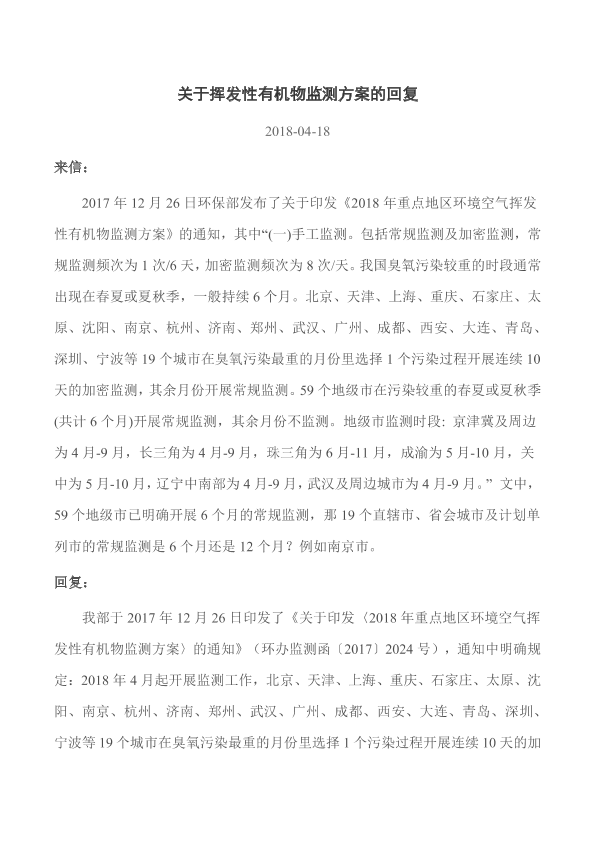 来信: 2017年12月26日环保部发布了关于印发《2018年重点地区环境空气挥发性有机物监测方案》的通知,其中“(一)手工监测。包括常规监测及加密监测,常规监测频次为1次/6天,加密监测频次为8次/天。我国臭氧污染较重的时段通常出现在春夏或夏秋季,一般持续6个月。北京、天津、上海、重庆、石家庄、太原、沈阳、南京、杭州、济南、郑州、武汉、广州、成都、西安、大连、青岛、深圳、宁波等19个城市在臭氧污染最重的月份里选择1个污染过程开展连续10天的加密监测,其余月份开展常规监测。59个地级市在污染较重的春夏或夏秋季(共计6个月)开展常规监测,其余月份不监测。地级市监测时段: 京津冀及周边为4月-9月,长三角为4月-9月,珠三角为6月-11月,成渝为5月-10月,关中为5月-10月,辽宁中南部为4月-9月,武汉及周边城市为4月-9月。” 文中,59个地级市已明确开展6个月的常规监测,那19个直辖市、省会城市及计划单列市的常规监测是6个月还是12个月?例如南京市。