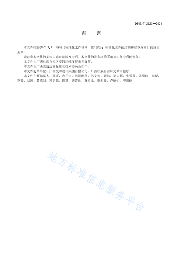 本文件按照GB/T1.1-2020《标准化工作导则 第1部分:标准化文件的结构和起草规则》的规定起草。 请注意本文件的某些内容可能涉及专利。本文件的发布机构不承担识别专利的责任。 本文件由广西壮族自治区交通运输厅提出并宣贯。 本文件由广西交通运输标准化技术委员会归口。 本文件起草单位:广西交通设计集团有限公司、广西壮族自治区交通运输厅。 本文件主要起草人:周旺、农正定、欧阳湘萍、孙文俊、黄浩、简志辉、张雪莲、孟崇峥、秦跃、李毅、刘涛、黄德剑、冯名慧、简慧、唐诗韵、苏治北、谢和壮、卢德佑、李凯昭。