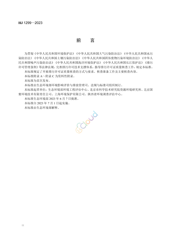 为贯彻《中华人民共和国环境保护法》《中华人民共和国大气污染防治法》《中华人民共和国水污染防治法》《中华人民共和国土壤污染防治法》《中华人民共和国固体废物污染环境防治法》《中华人民共和国噪声污染防治法》《中华人民共和国海洋环境保护法》《中华人民共和国长江保护法》《排污许可管理条例》等法律法规,完善排污许可技术支撑体系,指导排污许可证质量核查工作,制定本标准。 本标准规定了开展排污许可证质量核查的方式与要求、核查准备工作及主要核查内容。 本标准附录 A~附录 C 为资料性附录。 本标准为首次发布。 本标准由生态环境部环境影响评价与排放管理司、法规与标准司组织制订。 本标准起草单位:生态环境部环境工程评估中心、北京市科学技术研究院资源环境研究所、北京国寰环境技术有限责任公司、上海环境保护有限公司、陕西省环境调查评估中心。 本标准生态环境部 2023 年 6 月 7 日批准。 本标准自 2023 年 7 月 1 日起实施。 本标准由生态环境部解释。