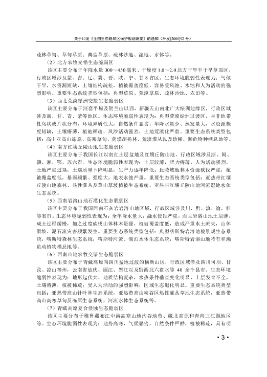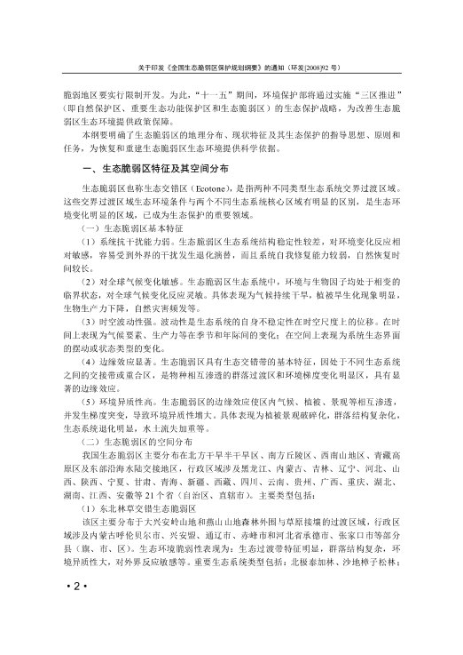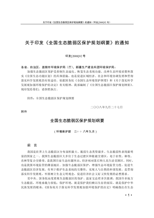 加强生态脆弱区保护是控制生态退化、恢复生态系统功能、改善生态环境质量和落实《全国生态功能区划》的具体措施,也是促进区域经济、社会和环境协调发展和贯彻落实科学发展观的有效途径。依据国务院《全国生态环境保护纲要》和《关于落实科学发展观加强环境保护的决定》有关精神,我部编制了《全国生态脆弱区保护规划纲要》。现印发给你们,请参照执行。 附件:全国生态脆弱区保护规划纲要