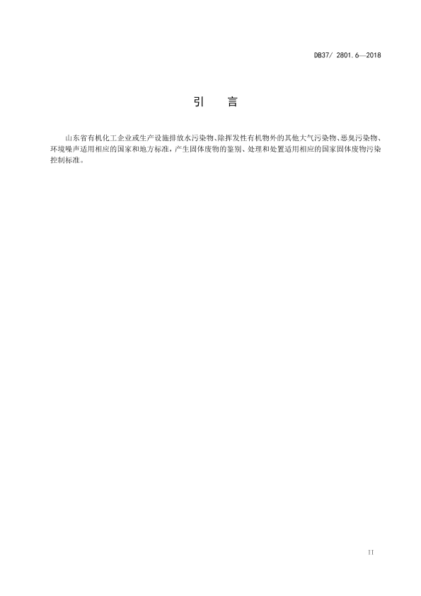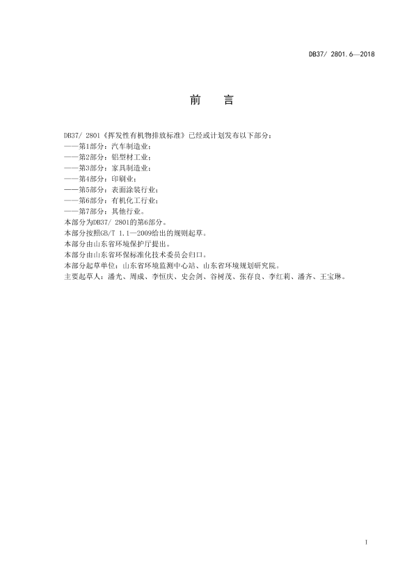 DB37/ 2801《挥发性有机物排放标准》已经或计划发布以下部分: 一一第1部分:汽车制造业; 一一第2部分:铝型材工业; 一一第3部分:家具制造业; 一一第4部分:印刷业; 一一第5部分:表面涂装行业; 一一第6部分:有机化工行业; 一一第7部分:其他行业。 本部分为DB37/ 2801的第6部分。 本部分按照GB/T 1. 1-2009给出的规则起草。 本部分由山东省环境保护厅提出。 本部分由山东省环保标准化技术委员会归口。 本部分起草单位:山东省环境监测中心站、山东省环境规划研究院。 主要起草人:潘光、周成、李恒庆、史会剑、谷树茂、张存良、李红莉、潘齐、王宝琳。