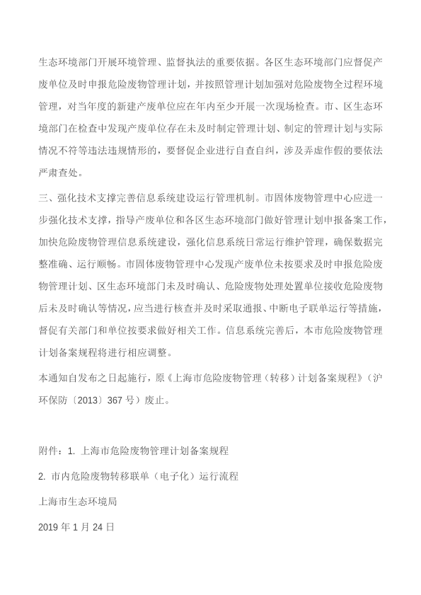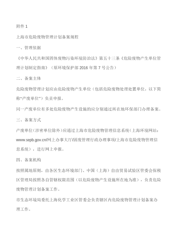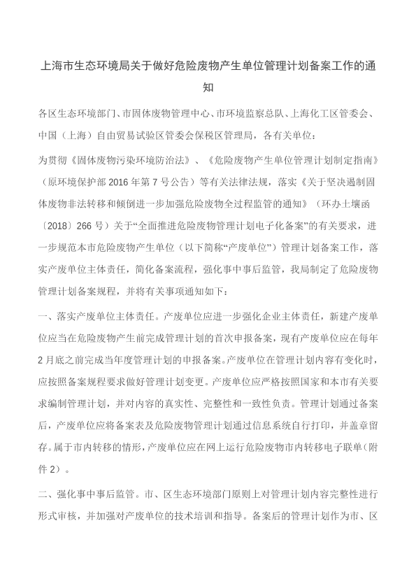 各区生态环境部门、市固体废物管理中心、市环境监察总队、上海化工区管委会、中国(上海)自由贸易试验区管委会保税区管理局,各有关单位: 为贯彻《固体废物污染环境防治法》、《危险废物产生单位管理计划制定指南》(原环境保护部2016年第7号公告)等有关法律法规,落实《关于坚决遏制固体废物非法转移和倾倒进一步加强危险废物全过程监管的通知》(环办土壤函〔2018〕266号)关于“全面推进危险废物管理计划电子化备案”的有关要求,进一步规范本市危险废物产生单位(以下简称“产废单位”)管理计划备案工作,落实产废单位主体责任,简化备案流程,强化事中事后监管,我局制定了危险废物管理计划备案规程,并将有关事项通知如下: