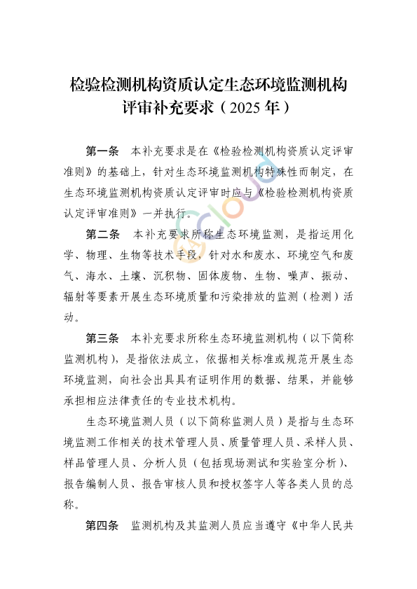 各省、自治区、直辖市和新疆生产建设兵团市场监管局(厅、委)、生态环境厅: 为全面提升生态环境监测机构能力,规范生态环境监测机构资质认定技术评审工作,市场监管总局、生态环境部联合制定了《检验检测机构资质认定生态环境监测机构评审补充要求(2025年)》(以下简称《补充要求(2025年)》),现予发布,自2026年1月1日起施行。有关事项通知如下: 一、首次申请生态环境监测领域检验检测机构资质认定的机构应满足《补充要求(2025年)》的全部规定。 二、已取得生态环境监测领域检验检测机构资质认定的机构,在原资质认定证书有效期内,可继续开展相关检验检测活动;申请扩项、变更时,扩项、变更部分应满足《补充要求(2025年)》的相应规定;原资质认定证书有效期届满,申请复查换证时应满足《补充要求(2025年)》的全部规定。 附件:检验检测机构资质认定生态环境监测机构评审补充要求(2025年) 市场监管总局 生态环境部 2025年12月16日