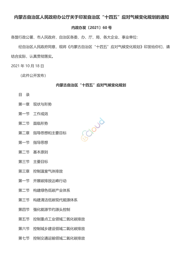 各盟行政公署、市人民政府,自治区各委、办、厅、局,各大企业、事业单位: 经自治区人民政府同意,现将《内蒙古自治区“十四五”应对气候变化规划》印发给你们,请结合实际,认真贯彻落实。 2021年10月18日