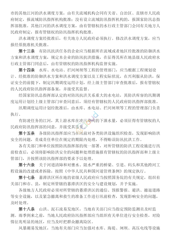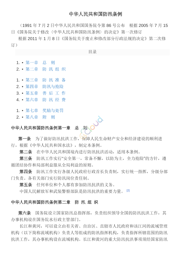 1991年7月2日中华人民共和国国务院令第86号发布中华人民共和国防汛条例,2005年7月15日《国务院关于修订〈中华人民共和国防汛条例〉的决定》修订发布。 根据2011年1月8日《国务院关于废止和修改部分行政法规的决定》第二次修订,自发布之日起施行。