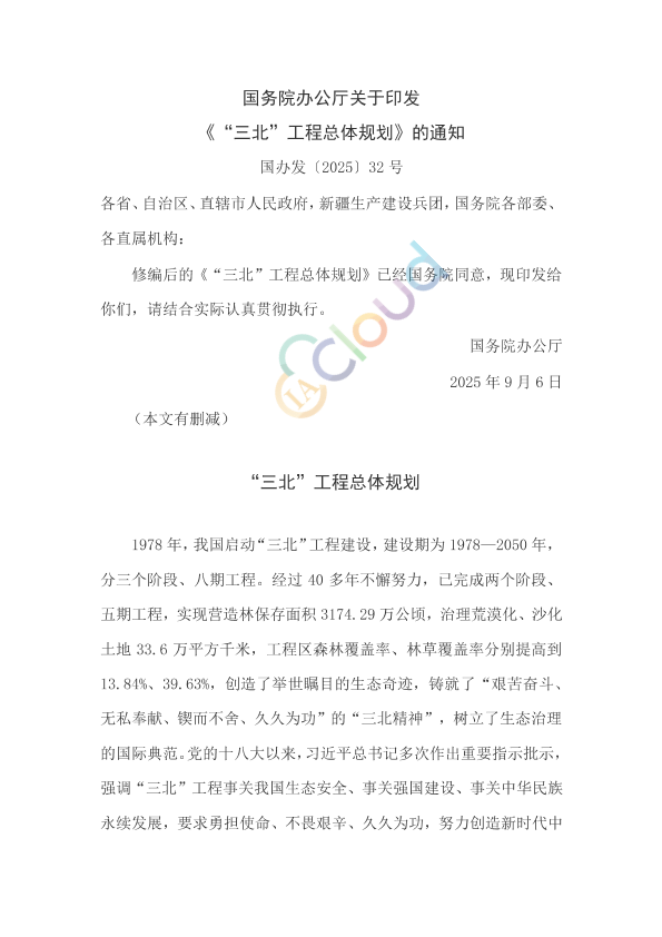各省、自治区、直辖市人民政府,新疆生产建设兵团,国务院各部委、各直属机构: 修编后的《“三北”工程总体规划》已经国务院同意,现印发给你们,请结合实际认真贯彻执行。 国务院办公厅 2025年9月6日