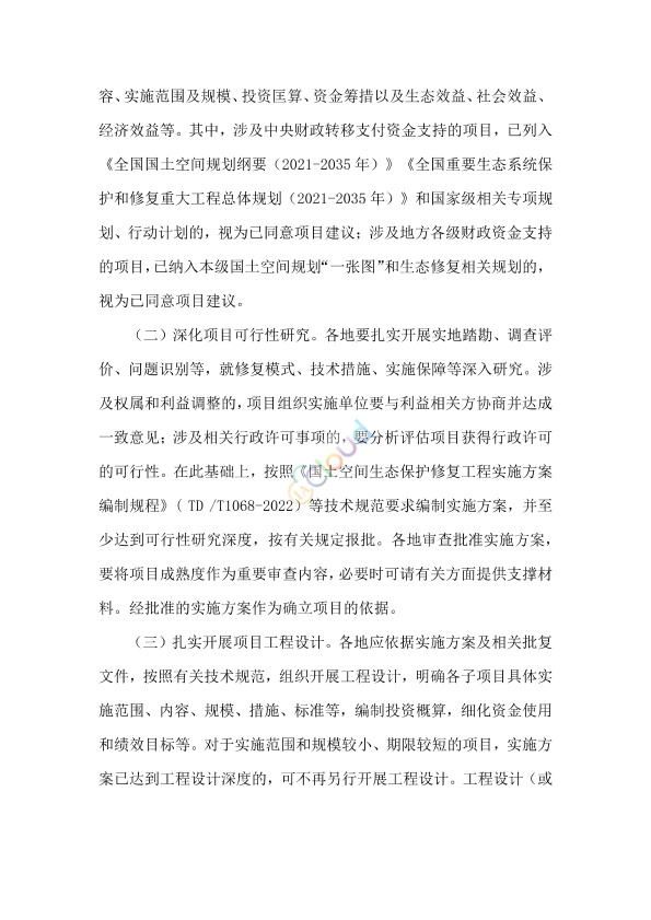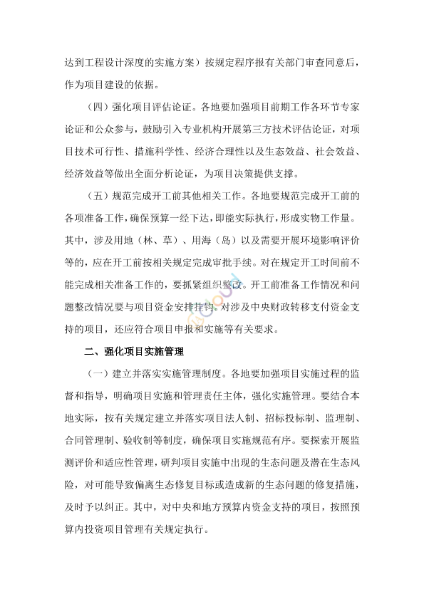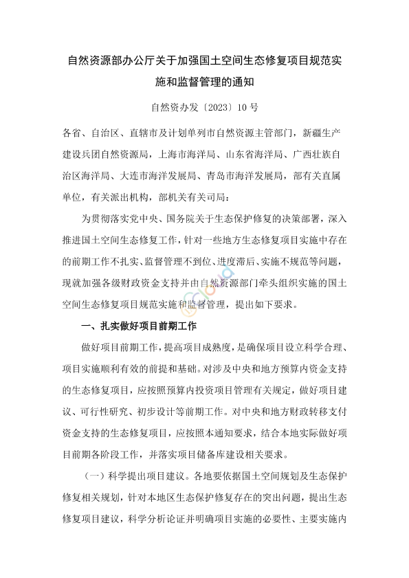 各省、自治区、直辖市及计划单列市自然资源主管部门,新疆生产建设兵团自然资源局,上海市海洋局、山东省海洋局、广西壮族自治区海洋局、大连市海洋发展局、青岛市海洋发展局,部有关直属单位,有关派出机构,部机关有关司局: 为贯彻落实党中央、国务院关于生态保护修复的决策部署,深入推进国土空间生态修复工作,针对一些地方生态修复项目实施中存在的前期工作不扎实、监督管理不到位、进度滞后、实施不规范等问题,现就加强各级财政资金支持并由自然资源部门牵头组织实施的国土空间生态修复项目规范实施和监督管理,提出如下要求。