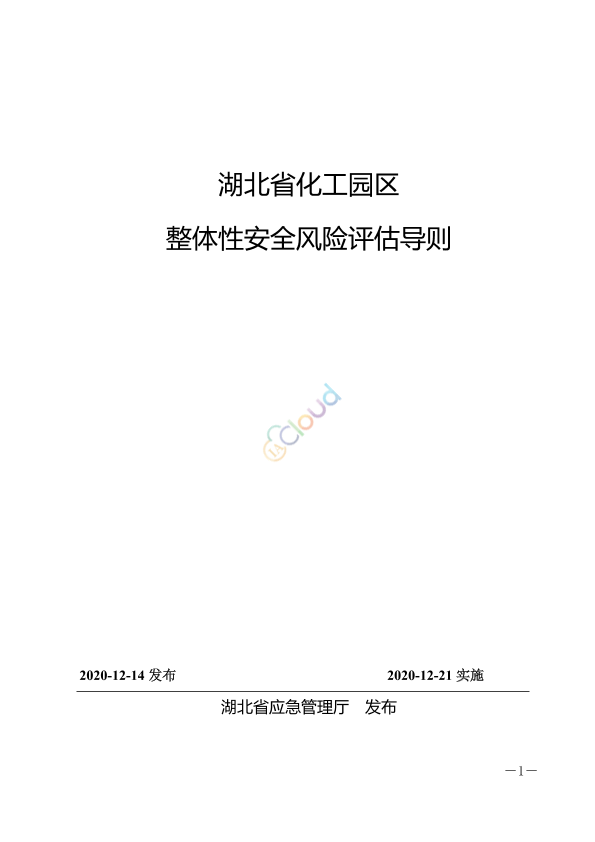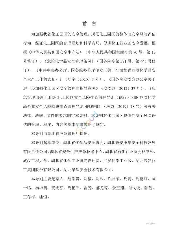 为加强我省化工园区的安全管理,规范化工园区的整体性安全风险评估行为,保证化工园区的合理规划和科学布局,促进化工行业的安全发展,根据《中华人民共和国安全生产法》(中华人民共和国主席令第70号,第13号修订)、《危险化学品安全管理条例》(国务院令第591号,第645号修订)、《中共中央办公厅、国务院办公厅印发〈关于全面加强危险化学品安全生产工作的意见〉》(厅字〔2020〕3号)、《国务院安委会办公室关于进一步加强化工园区安全管理的指导意见》(安委办〔2012〕37号)、《应急管理部关于印发和的通知》(应急〔2019〕78号)等有关法律、法规、文件的要求制定本导则。本导则对化工园区整体性安全风险评估的管理、程序、内容等基本要求做出了规定。 本导则由湖北省应急管理厅提出。 本导则起草单位:湖北省化学品安全协会、湖北寰安康华安全科技发展有限责任公司、湖北省安全生产应急救援中心、湖北省石化行业协会秘书处、武汉工程大学、湖北省化学工业研究设计院、武汉化学工业区、湖北兴发化工集团股份有限公司、湖北景深安全技术有限公司。 本导则主要起草人:詹学贵、刘毅、刘欢、许开荣、周涛、周德红、刘一鸣、杨坤明、龚光芬、周艳兵、雷芳、郝龙琼、余玉翔、肖弋俊、颜靓、王冬梅、潘恒。