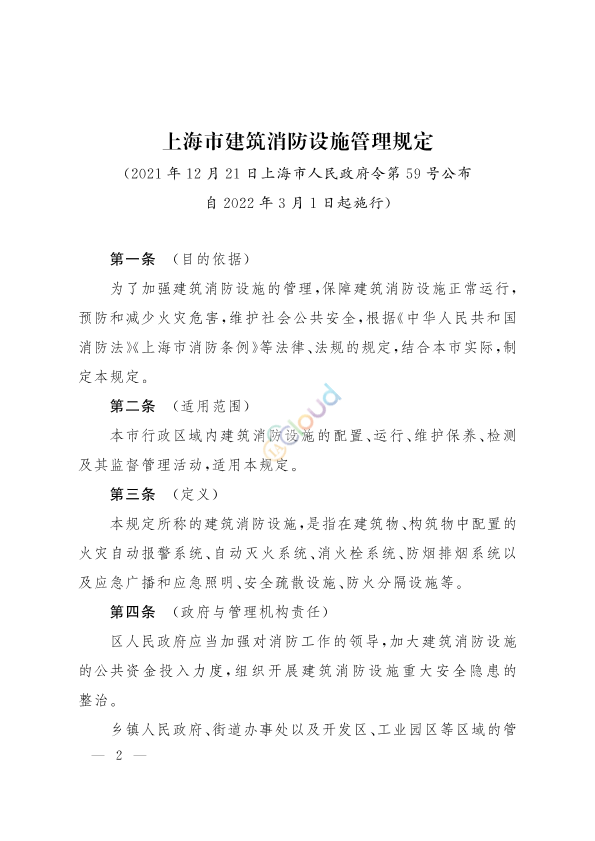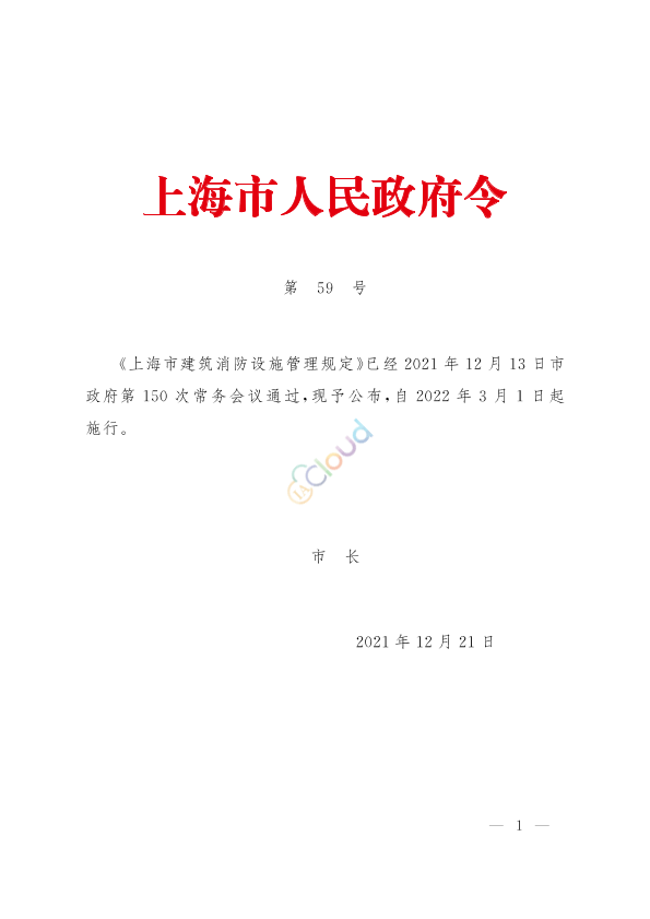 《上海市建筑消防设施管理规定》已经2021年12月13日市政府第150次常务会议通过,现予公布,自2022年3月1日起施行。 市长 龚正 2021年12月21日