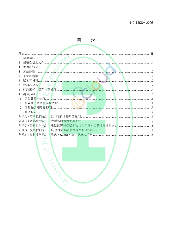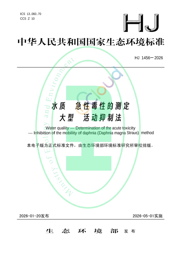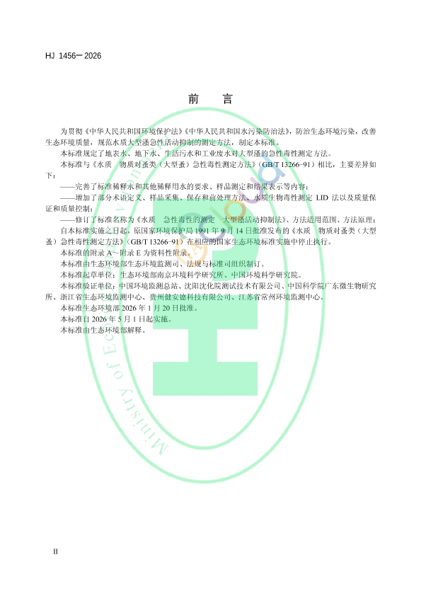 为贯彻《中华人民共和国环境保护法》《中华人民共和国水污染防治法》,防治生态环境污染,改善生态环境质量,规范水质大型溞急性活动抑制的测定方法,制定本标准。