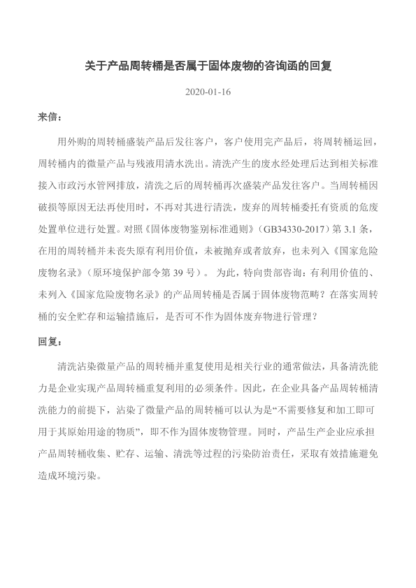 来信: 用外购的周转桶盛装产品后发往客户,客户使用完产品后,将周转桶运回,周转桶内的微量产品与残液用清水洗出。清洗产生的废水经处理后达到相关标准接入市政污水管网排放,清洗之后的周转桶再次盛装产品发往客户。当周转桶因破损等原因无法再使用时,不再对其进行清洗,废弃的周转桶委托有资质的危废处置单位进行处置。对照《固体废物鉴别标准通则》(GB34330-2017)第3.1条,在用的周转桶并未丧失原有利用价值,未被抛弃或者放弃,也未列入《国家危险废物名录》(原环境保护部令第39号)。 为此,特向贵部咨询:有利用价值的、未列入《国家危险废物名录》的产品周转桶是否属于固体废物范畴?在落实周转桶的安全贮存和运输措施后,是否可不作为固体废弃物进行管理?